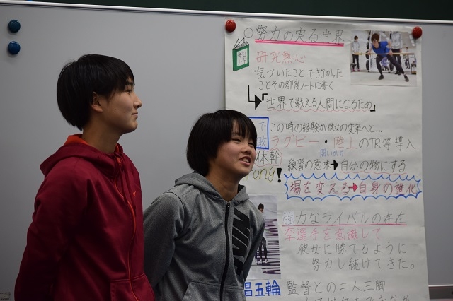 夜には平昌オリンピックの金メダリストの選手がどのようにして金メダルをとることができたのかを、アンジュヴィオレBINGOから3グループ、JFAアカデミー福島から3グループずつ発表しました。アンジュヴィオレBINGOの皆さんは、私達にはないアイデアがたくさんあって、どのグループもすごく印象に残り、楽しませてもらいました。全てのグループにそれぞれの特徴があり、思いが伝わる良い発表にすることができたと思います。