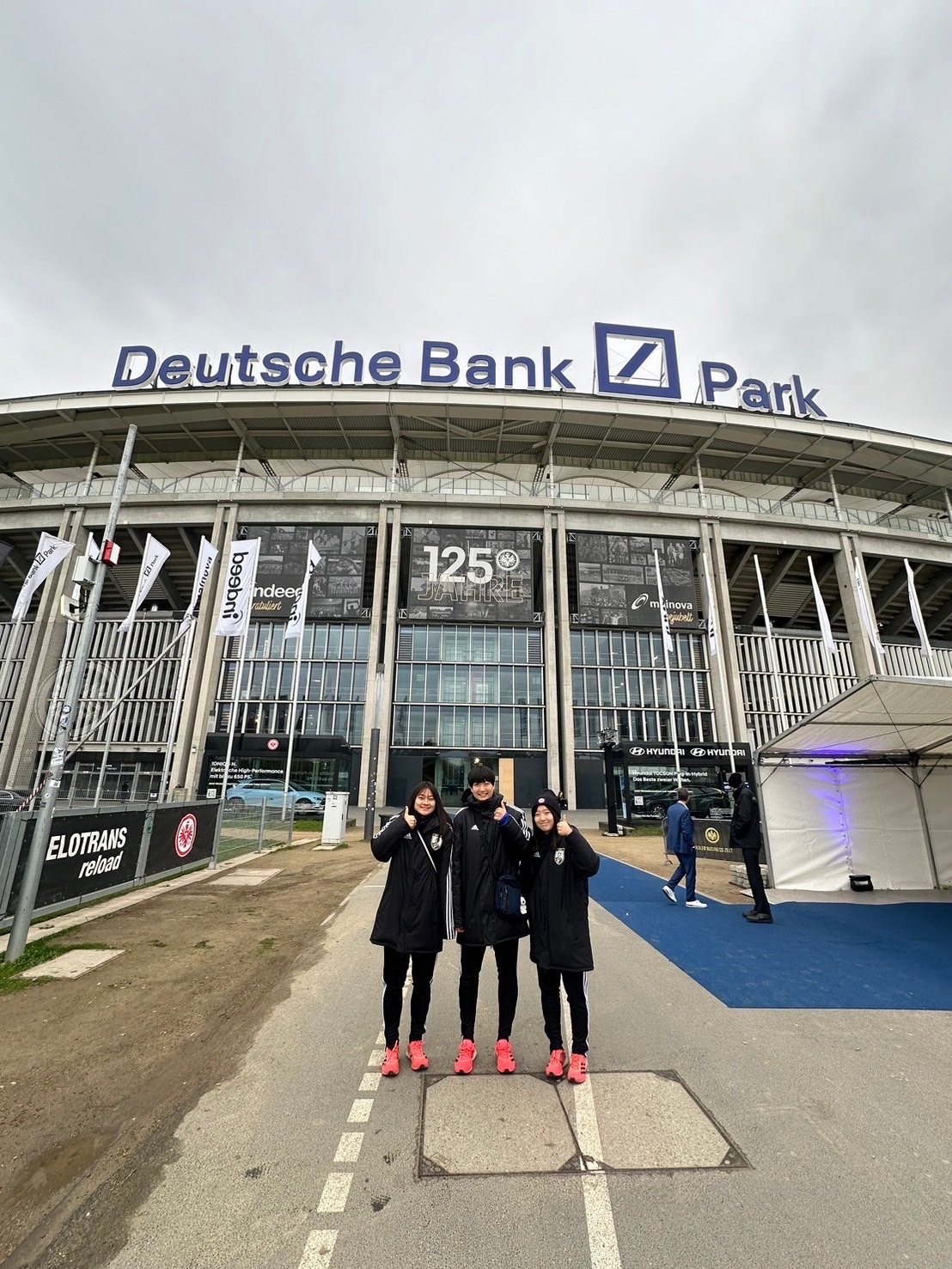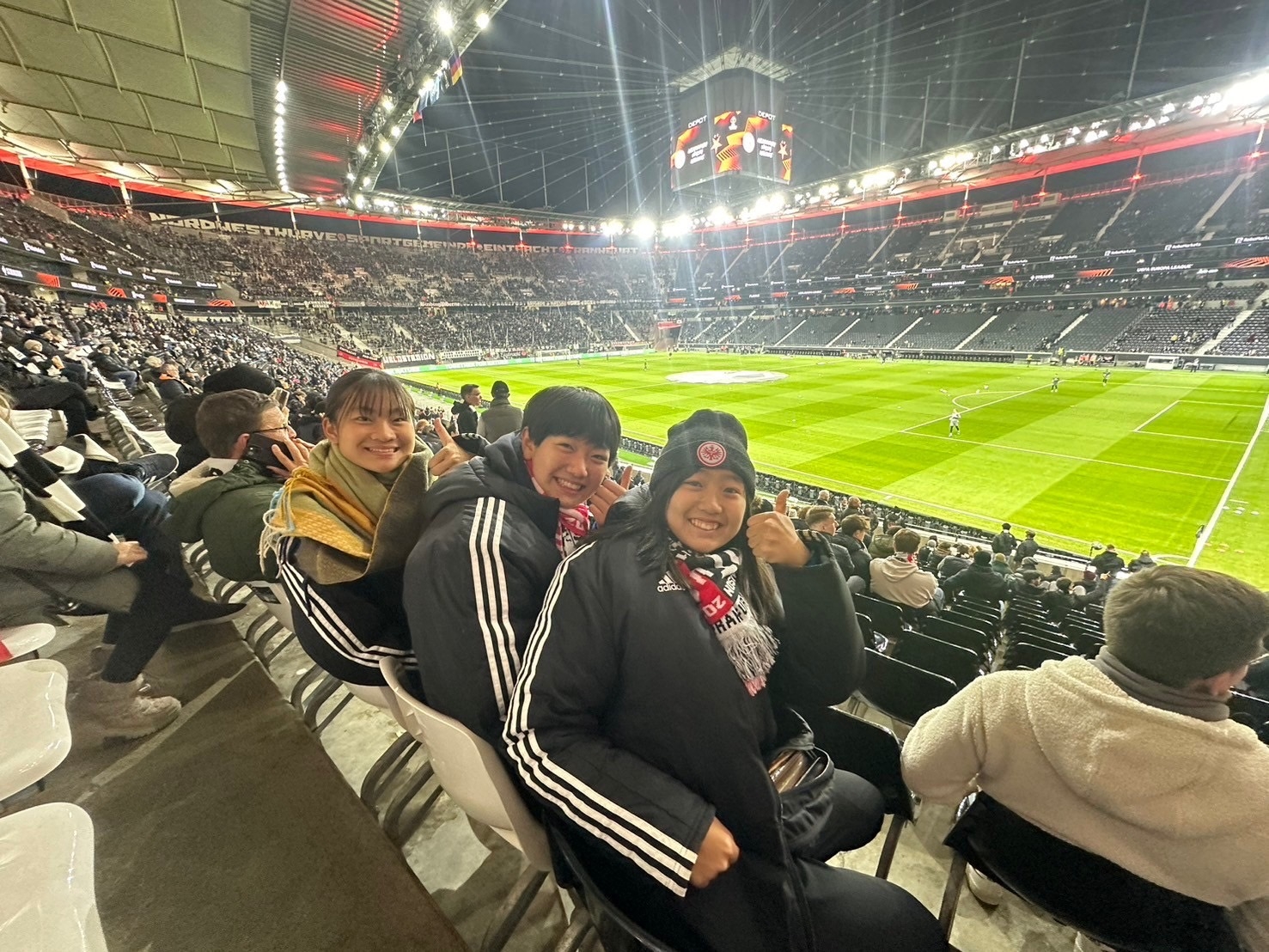 私は初めての海外で、最初はすごく緊張していたけど、ホストファミリーの皆さんやフランクフルトのスタッフの方、選手のみんながとても優しく接してくれたので、楽しんで過ごすことができました。ONの部分では、フィジカルやスピードの違いを感じましたが、足下の技術やプレーの器用さは、アカデミーの方がレベルが高いと思いました。日頃からもっと、1本1本のパスの質をこだわって、受け手が次のプレーをしやすいところに出すということを意識して練習を行っていきたいと思います。OFFのところでは、試合観戦や、TR見学、フランクフルト市街の観光などに加え、ドイツの学校に行き、とても良い経験をすることができました。特に試合観戦では、プレースピードが速く、球際の強さなどの違いや、試合状況を読み取ること、観客の熱狂度の違いなど、様々なことが学べました。ドイツの学校は授業中の態度などで違いを感じました。今回の海外研修は、自分の苦手なコミュニケーションをとるということを少しでも克服できればと思って臨みました。最初は少し苦手意識を持っていたので、上手く伝えようとせず、わかる範囲の単語、文法で伝えると理解してくれましたが、正しい英語を覚えてスムーズに話せるようになりたいと思いました。この活動で学んだことや、経験を、将来に活かしていけるようにしたいと思いました。