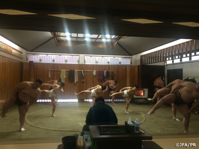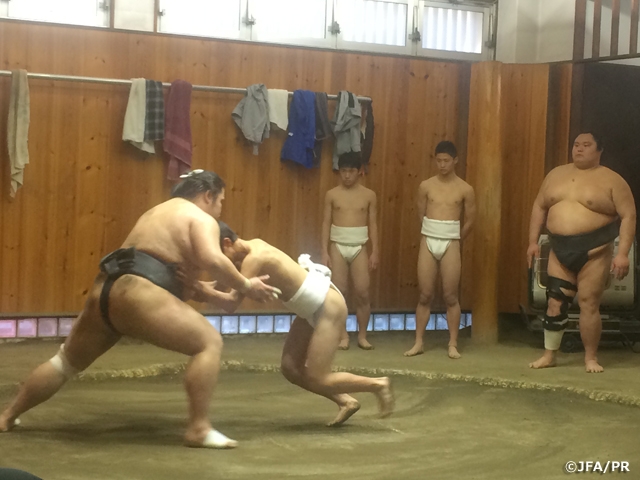 12日(日)の朝には、田嶋幸三JFA会長が千賀ノ浦部屋を訪れ、朝稽古を見学しました。四股から股割り、すり足。ひとつひとつの動作を丁寧に行いながら、稽古はテンポよく進んでいきます。必死についていくアカデミー生に「腰を落として」と親方からも声がかかります。力士同士のぶつかり稽古の際には、その迫力にアカデミー生が真剣な眼差しで見入っていました。稽古の最後には、舛天竜関の胸を借りてアカデミー生がぶつかり稽古に挑戦しました。