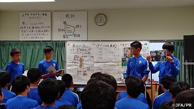 7/18(水)、19(木)に、JFAアカデミー福島の12期生(中3)と13期生(中2)が、夏休みに実施する海外遠征の事前学習プレゼンテーションを行いました。JFAアカデミー福島のJrユース年代は、中学2年次に東南アジア方面(今年度はタイ)へ、中学3年次にヨーロッパ方面(今年度はドイツ)へ海外遠征を行います。今回のプレゼンテーションは、グループごとに、遠征先の「文化」、「歴史面」、「サッカー」などを調べて、それを発表しました。