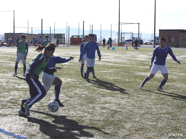 1月9日にJFAアカデミー福島のユースチームは新年初トレーニングを行いました。男子の選手と女子の選手が集まり、ミニゲーム大会を行いました。合同練習では選手が中心となって各自で準備をし、進行しました。男子の選手と女子の選手が一緒プレーする機会はなかなか無く、お互いに刺激となるトレーニングになりました。スモールコートでのゲームでは足元の技術が要求され、普段なかなか見ることができないようなプレーなども各所で見られました。