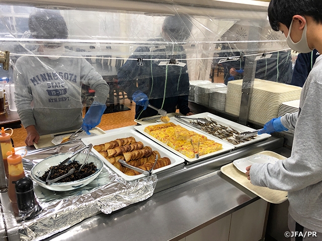 JFAアカデミー福島では、食事による栄養摂取を重視しているため、サプリメントやプロテインなどの摂取を禁止しています。そのため選手たちは、身体作りや疲労回復のために、どのような食事の摂り方が望ましいのか、日々学び、そして考えながら生活しています。