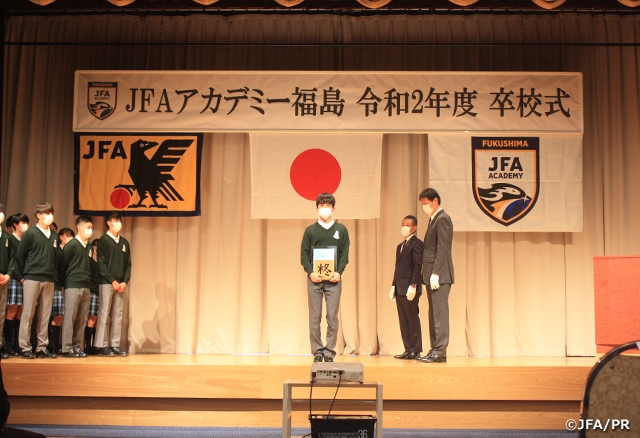 3月2日、JFAアカデミー福島10期生の卒校式を実施しました。今年度の卒校式は新型コロナウイルスの影響により、規模を縮小しての開催となりましたが、10期生(高3)の男子12名、女子7名はそれぞれ次のステージへと向かって新たな一歩を踏み出しました。