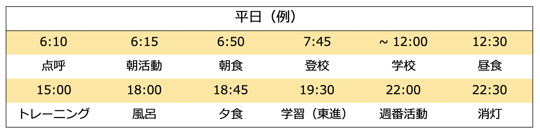 上記以外にも寮内で行われている活動は多々あります。そのうちの一つに委員会活動があります。委員会活動は集団生活の中でより良い暮らしやお互いの生活を尊重し合う上でとても重要な役割を担っています。他にも毎日の終わりには週番活動を行っています。週番活動は寮内の忘れ物や消灯忘れがないように週替わりの当番制で毎日活動をしています。選手たちはこのような活動を活用して自分たちで工夫して生活をしています。