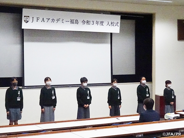 入校式は新型コロナウイルス感染予防のため規模を縮小して行われました。新入生6名はアカデミーを支えて下さっているご来賓の方々、地域の方々、保護者の方々の前で決意表明を行い、それぞれの夢の実現に向け日々努力していくことを誓いました。事前のリハーサルでは緊張からかやや表情の硬い選手やセリフを忘れてしまう選手も見られましたが、本番での決意を述べる様子は皆自信に満ち溢れていて素晴らしいものでした。新入生6名は新たな決意を胸に夢に向かって突き進んでいきます。彼女たちを温かい目で見守っていただければ幸いです。