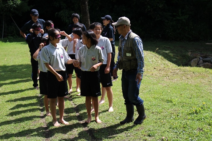 まず初めに、インストラクターの「かんちゃん」こと神原さんから、森の大切さのお話を聞いた後、視覚以外の五感を再確認しようということで、目隠しをして裸足で芝生や砂利、落ち葉、丸太など様々な道を歩きました。