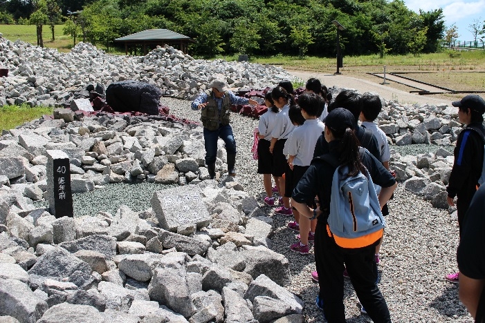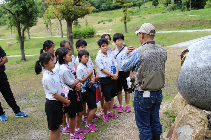 次に、直径1mの石の地球で、地球の構造や地球と月・太陽との関係のお話を聞きました。