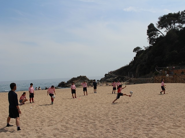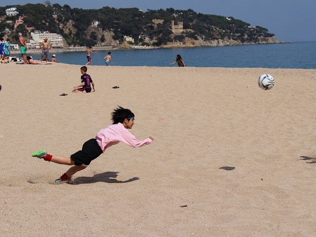 砂浜でのプレーは砂で足をとられるため正確なボールコントロールができず難しかったですが、リフティングリレーやダイビングヘッドでのシュートなど、みんなで楽しくトレーニングをすることができました。
