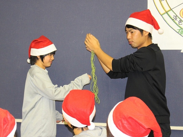みんなサンタの帽子をかぶり、席はくじで決めて座りました。
