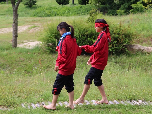 まず、2人1組になり1人が目隠しをして、もう1人が手を引いてサポートしながら砂利道や草の上などを裸足で歩きました。目隠しをすることで視覚から得られる情報が無くなり、聴覚や触覚を頼りに歩くことはとても怖く感じましたが、何気ない音や普段気にすることなく聞いている鳥の声などもよく聞こえた気がしました。