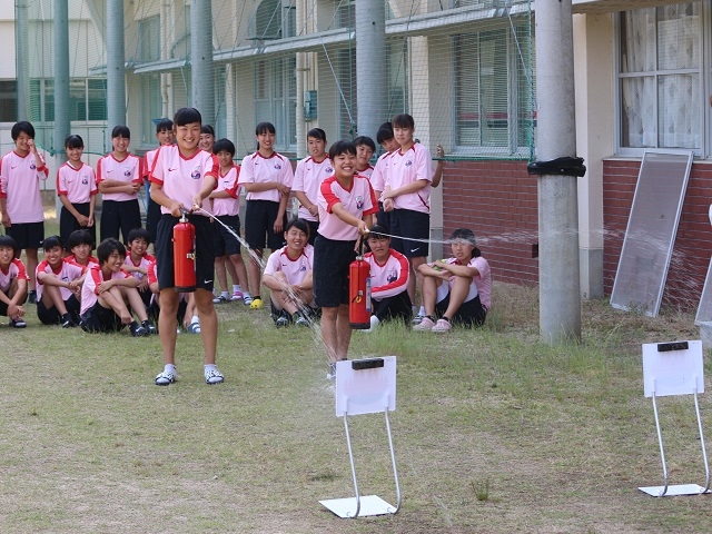 最後に、消火器の使い方について教えてもらいました。2人1組で「火事だー!」と言いながら消火の練習をしました。火元に向かって水をかけるのが少し難しかったです。