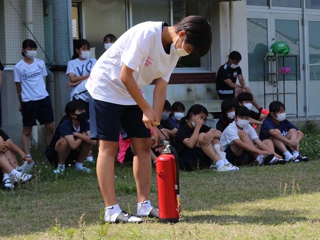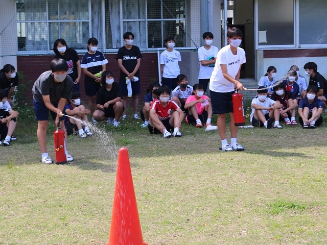 最後に避難をした後、水消火器を使って消火訓練をしました。