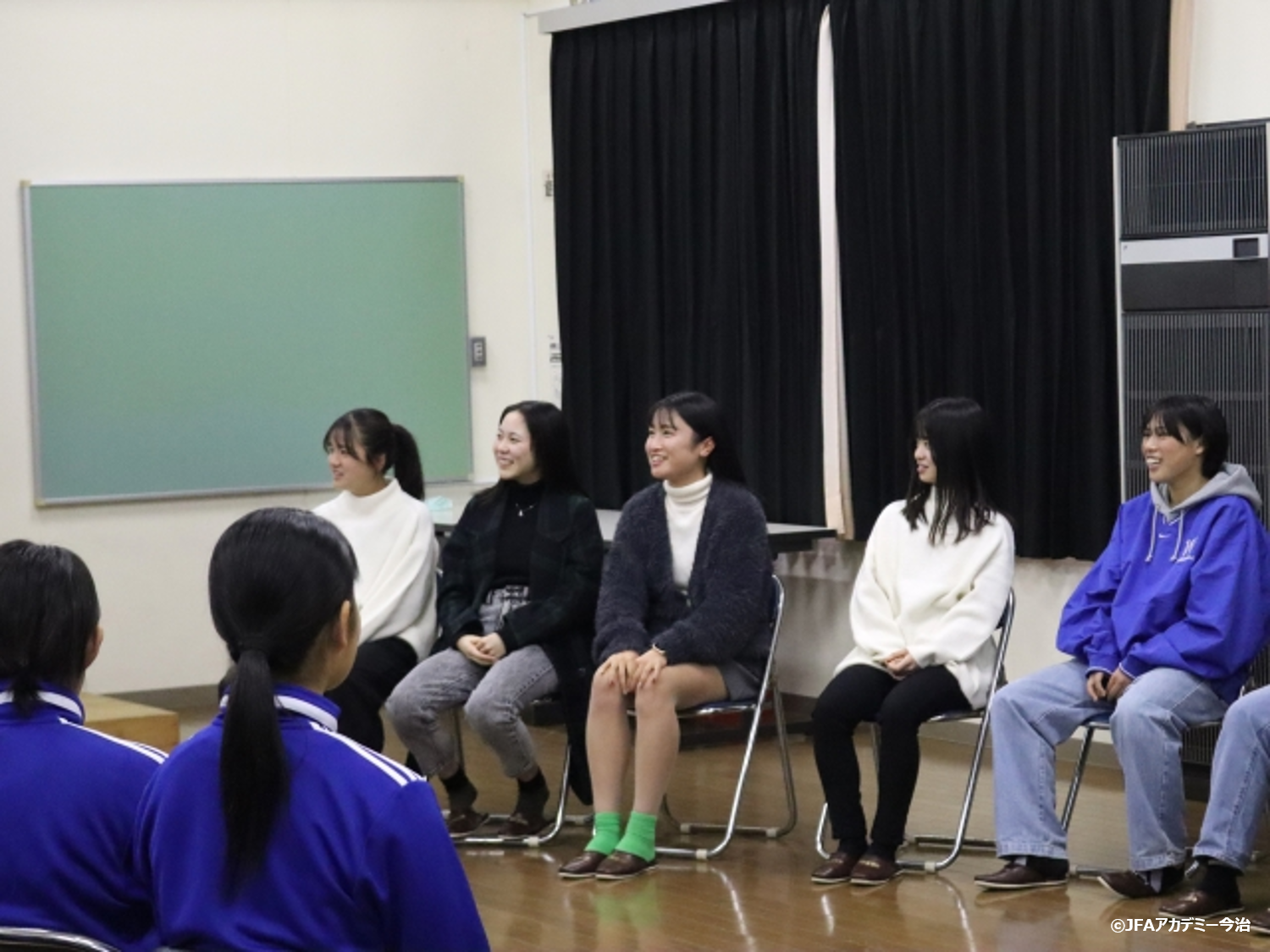 午前は4期生、保護者の方々、当時関わっていただいた先生方に来寮いただき、当時のアカデミーでの思い出話や在校生へのメッセージなど、交流会を行いました。午後は、桜井海浜ふれあい広場サッカー場にて、4期生vs在校生でOG戦を行いました。
