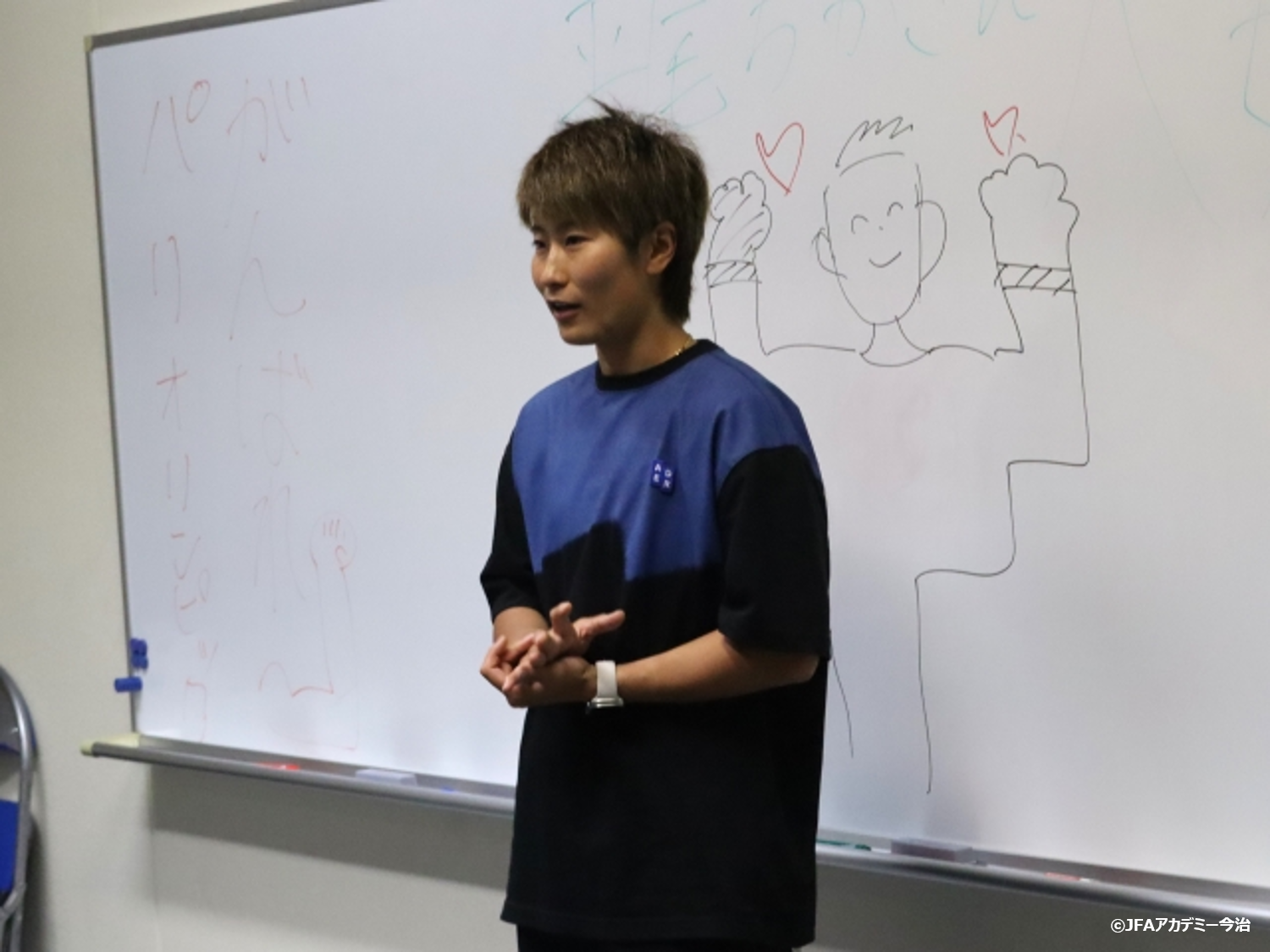レクチャーでは、平尾選手が過ごしてきたアカデミー生活の中で、今に活かされているJFAプログラムや寮生活での経験、日本代表として日本を背負う意味などを話していただき、選手たちは聞き漏らすまいと真剣に耳を傾け、質問をしていました。