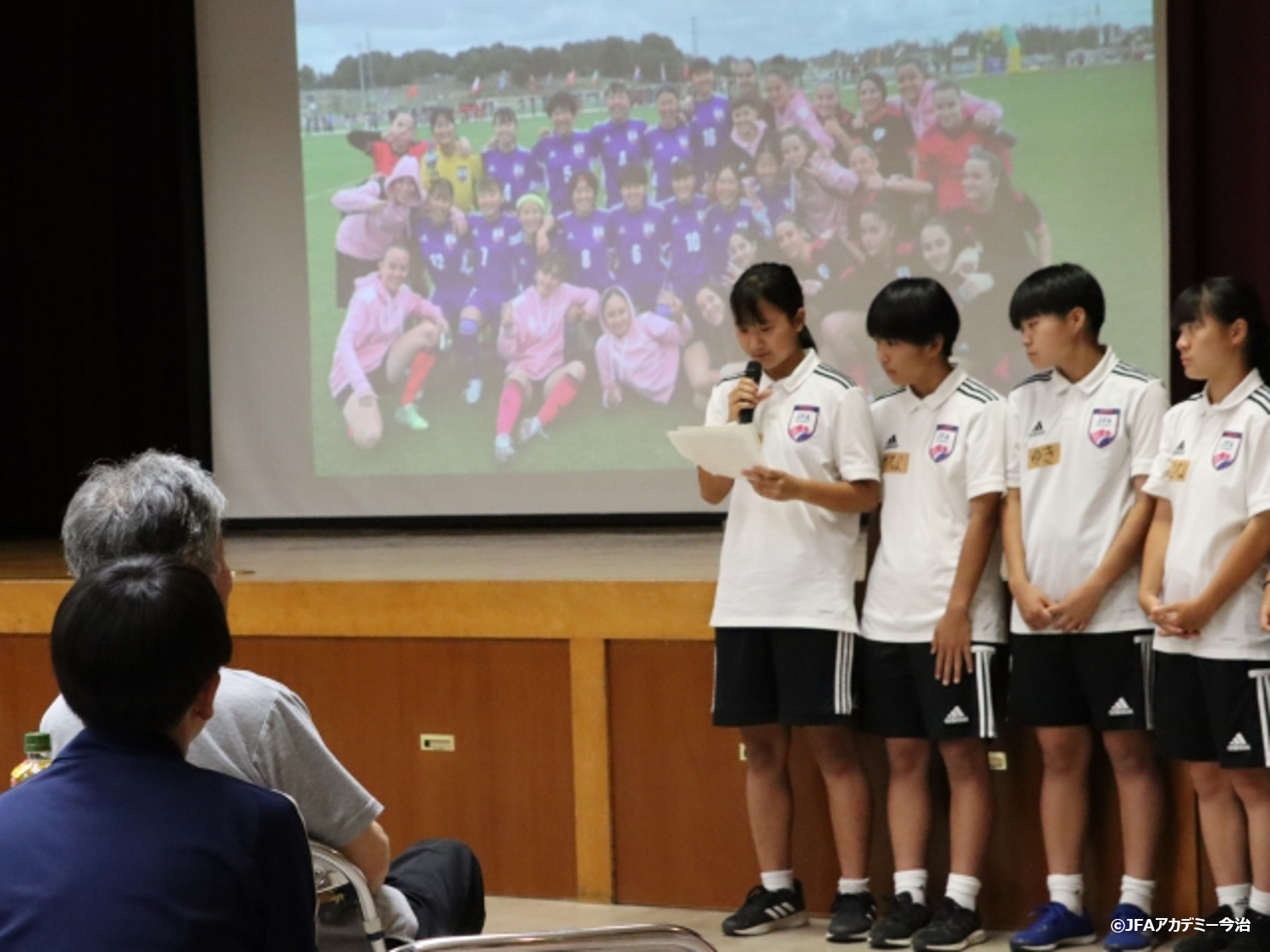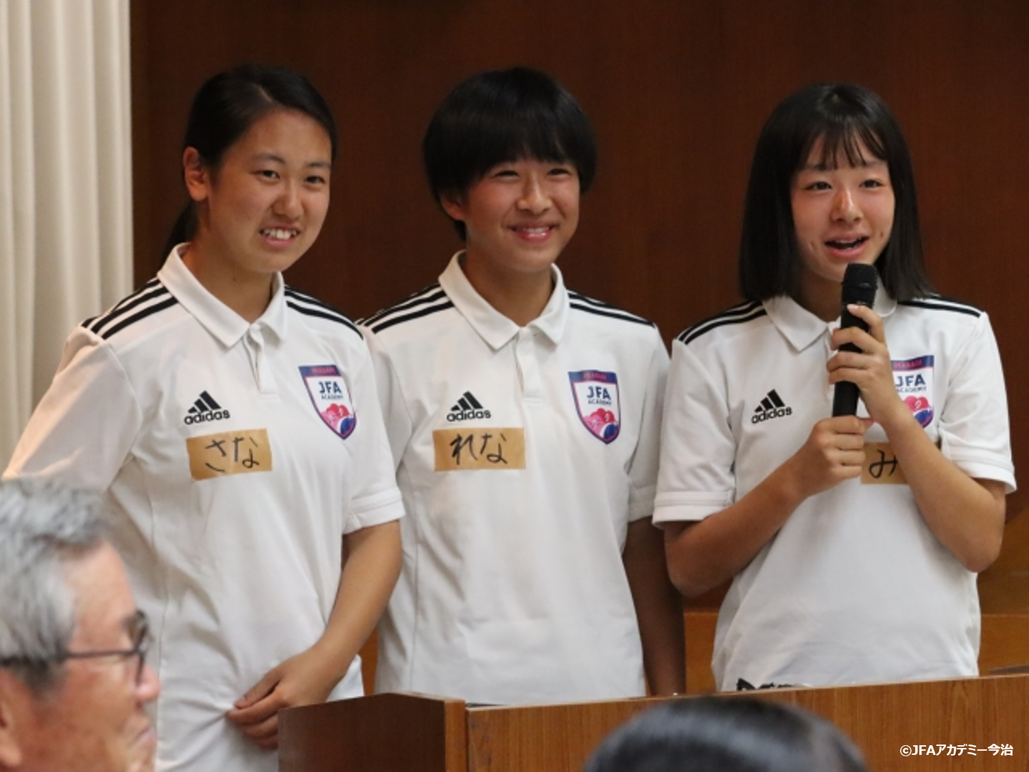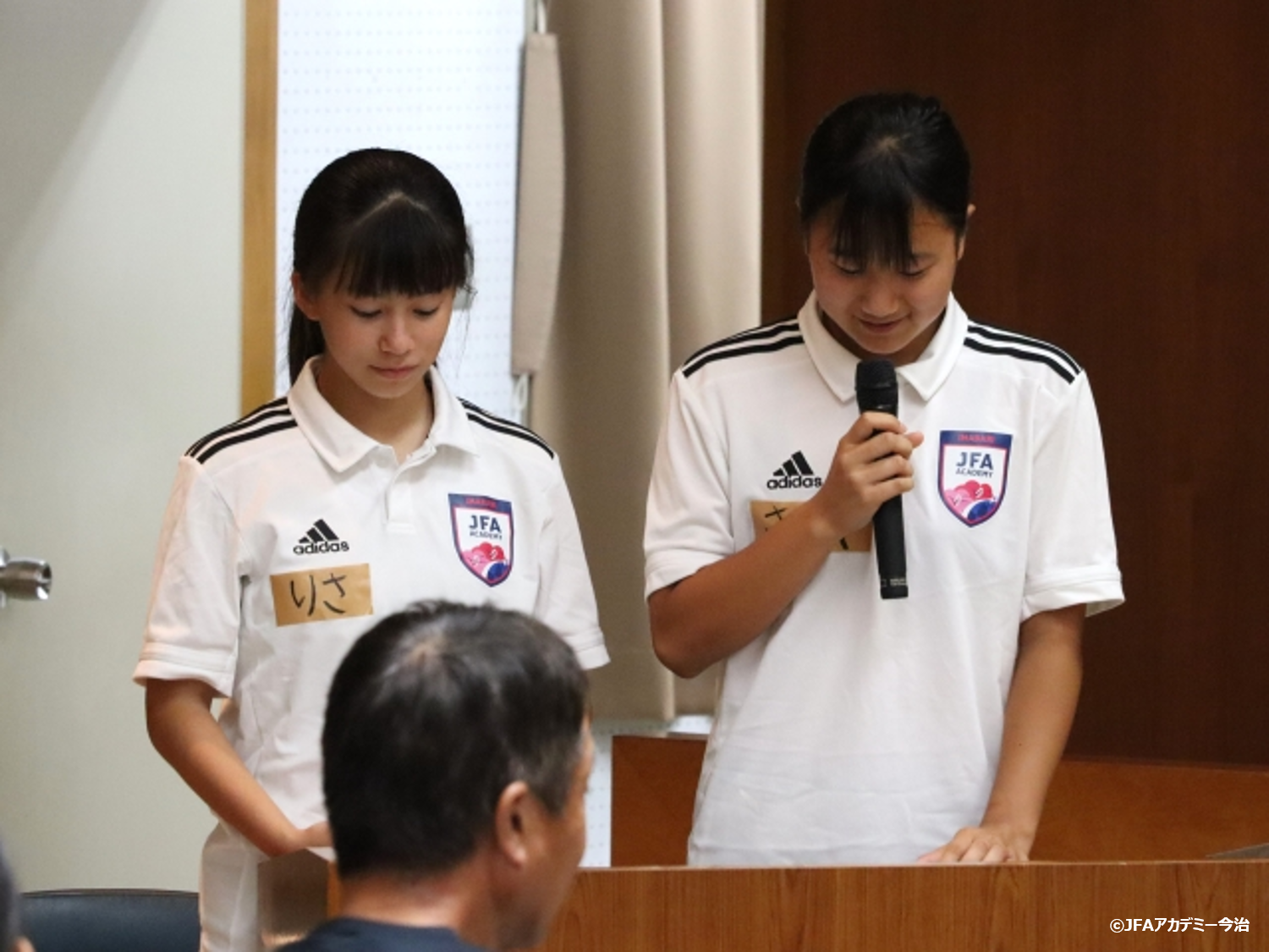 はじめに、9期生(中2)がJFAアカデミー今治の紹介とし、アカデミー生の1日の流れやJFAプログラムで取り組んでいることについて発表しました。次に、10期生(中1)が1学期を振り返って感じたことや、選考試験を経て合格通知をもらった時の心境について話しました。最後に、8期生(中3)が3月に実施した海外遠征の報告を行いました。