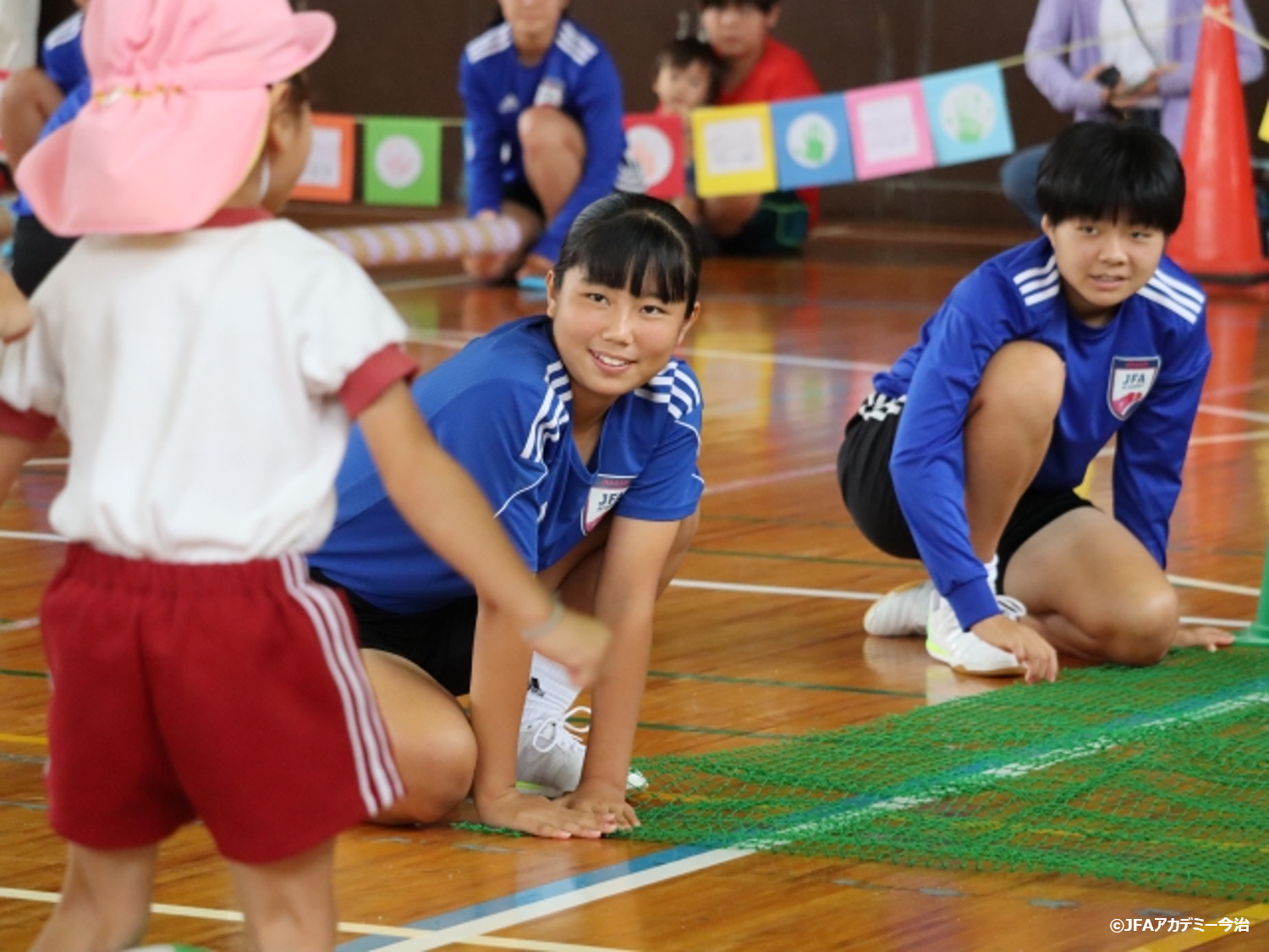 前日までの悪天候により体育館での実施となりましたが、アカデミー生は園児たちが練習の成果を発揮できるよう、保育園の先生方と連携をとりながら積極的に関わりました。また園児と一緒に参加する競技では、園児が楽しめるようコミュニケーションをとる姿が見られました。