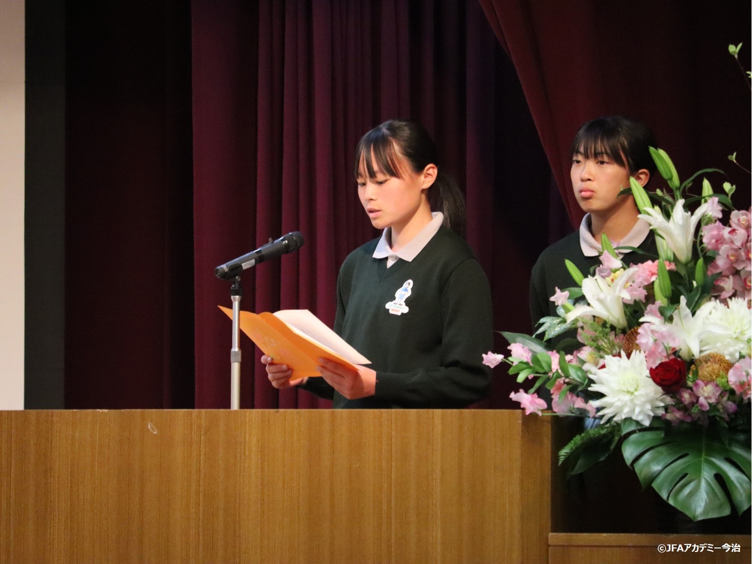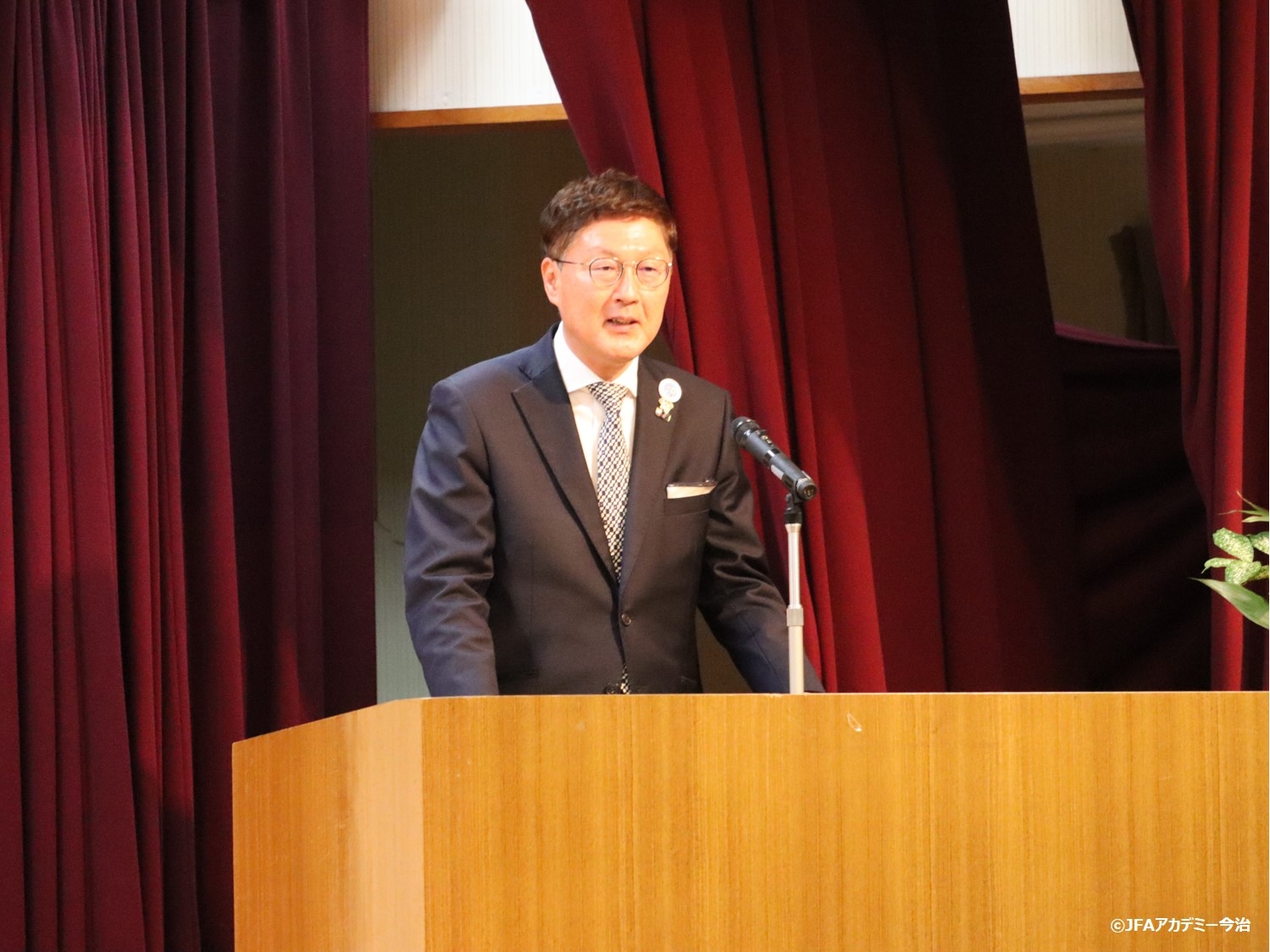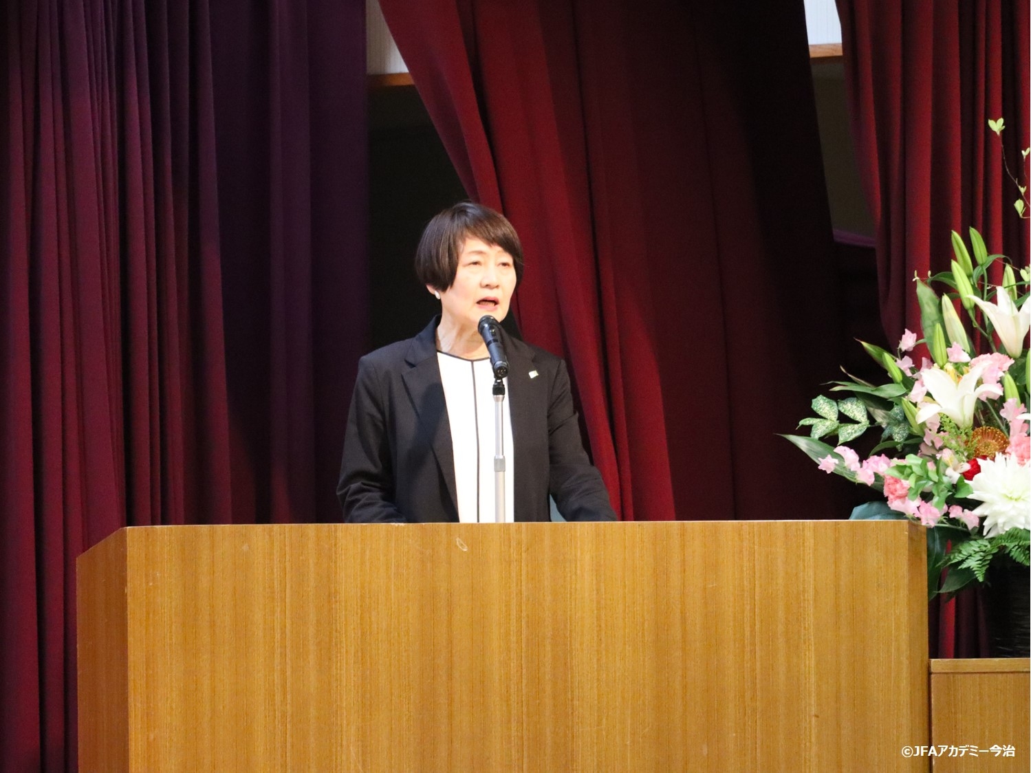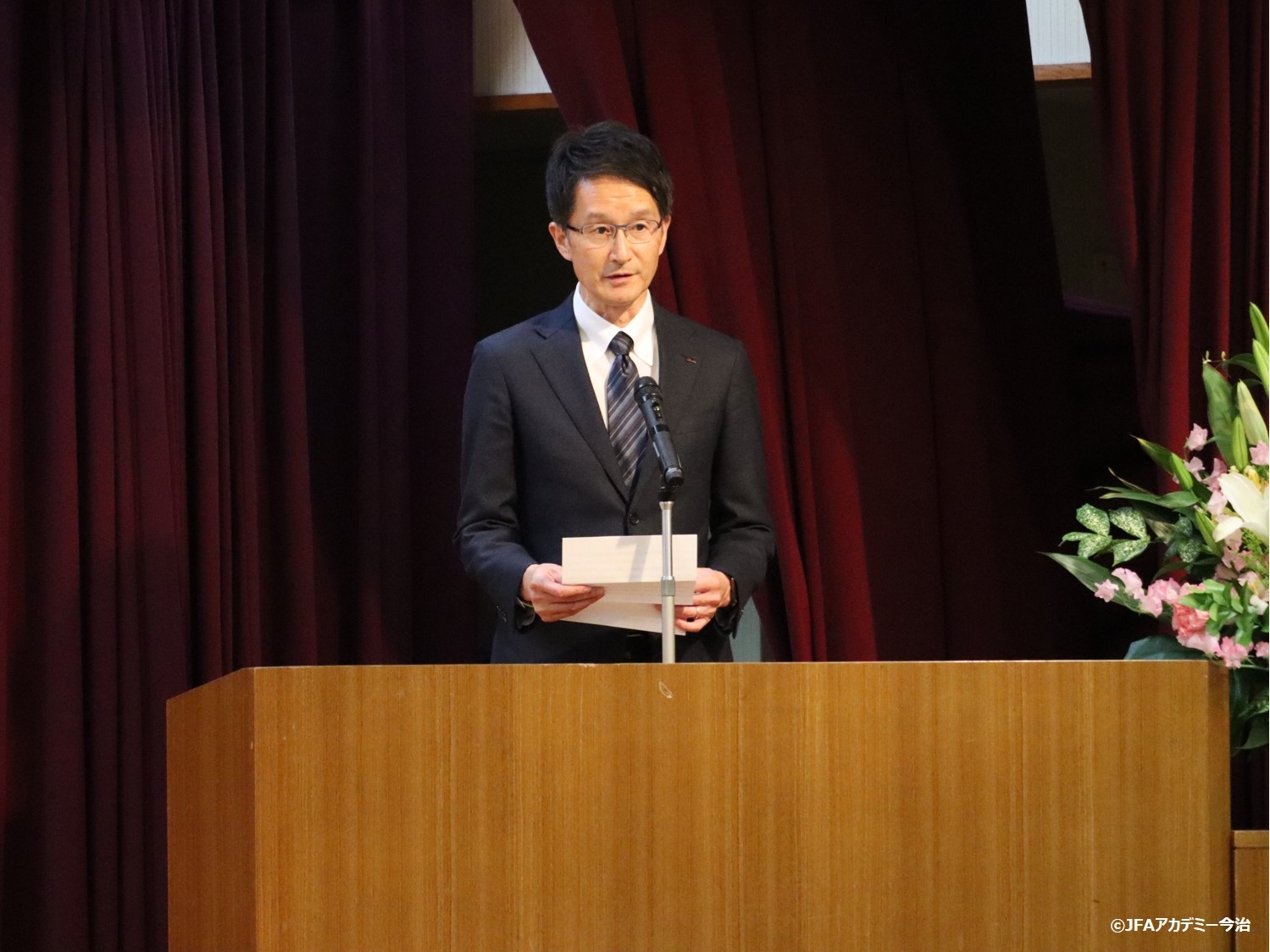 式では、三好公子スクールマスターの式辞、今治市の徳永繁樹市長からのご祝辞、日本サッカー協会(JFA)西澤和剛理事からの激励の言葉など、12期生の入校を歓迎するメッセージをたくさんいただきました。