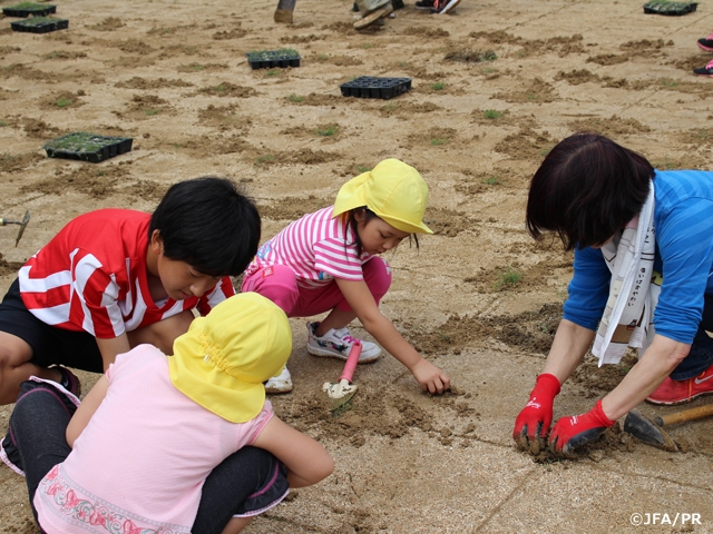 これは「JFAグリーンプロジェクト・ポッド苗方式・芝生化モデル事業」によるもので、JFAより無償で提供された13,600株のポッド苗を、アカデミーの選手たちが通う中学校の先生方、近隣地域の方々や保育園の園児、また今治しまなみスポーツクラブの職員ら約100余名の方々にご協力いただき実施しました。