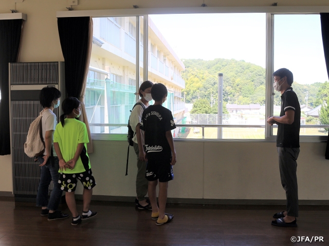 寮見学会は新型コロナウイルス感染予防に十分配慮し、時間帯を分けたうえで参加者の方に健康チェック、手指消毒、マスク着用などご協力いただいての実施となりました。JFAアカデミー今治は、今治市郊外の旧上朝小学校の校舎を改修して寮としているので、参加者の皆さんはアカデミー生が学校の中で生活をしていることに驚かれていました。また、この日も地域の方々が駐車場の草刈りを行っていただいていて、JFAアカデミー今治が地域の方々とのつながりで運営されていることを感じていただけたと思います。