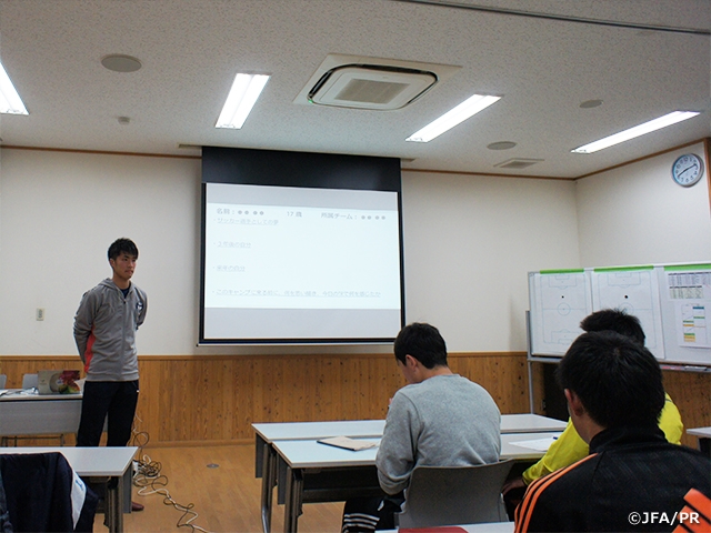 自分のサッカー選手としての夢は、日本を代表するプロサッカー選手になることです。そのために、3年後、年代別の代表に入ること、来年は、自チームでレギュラーを獲るという目標を成し遂げます。自分は、最近思うようにプレーできなくて、それを修正するきっかけを作るために参加しました。今日のトレーニングで色々な視点でプレーの仕方があることが、改めてわかりました。これから、自分で基準を作らず、努力し続けます。
