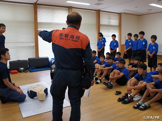 JFAアカデミーは、世界基準で活躍する選手を育成する取り組みとして、サッカーはもちろんのこと、人間的な面の教育も重視し、社会をリードする真の世界基準の人材育成を目指しています。JFAアカデミー熊本宇城では6月21日(金)、宇城広域連合南消防署小川分署のご協力のもと、JFAアカデミー熊本宇城内の研修室でアカデミー生全員が救急法講習会を受講しました。これは、ピッチ内外で起こる事柄に対して選手自らが解決して対応できるようになるための活動の一環として行われたものです。