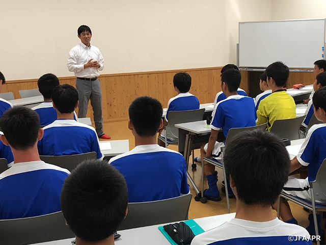 森保監督の話を聞いて、自分でトレーニングや練習試合の準備をしなければならないと感じました。今までは練習道具の準備やトレーニング前に少し体を動かすことなど、直前の準備だけだと思っていました。しかしレクチャーを聞いて、直前だけでなく前日の夜にもストレッチやアイシングなどの準備をした方が、次の日の練習で良いパフォーマンスができることを知りました。実際に日本代表選手もそう取り組んでいることを知り、これからの自分のためにも取り組みたいと思います。また、自分の武器を持つことです。僕が知っているサッカー選手たちには武器があります。しかし今の自分には武器と言えるものがありません。武器を持っている選手は武器を生かして試合で活躍しています。だから僕も早く武器が見つかるように、いろいろなプレーやポジションに挑戦していきたいです。そして森保監督は「今を大切に、今やることにベスト尽くす、今を楽しむ」と言っていました。僕も残り少ないアカデミーでの生活を大切にしてベスト尽くし、楽しみながら頑張っていこうと思います。