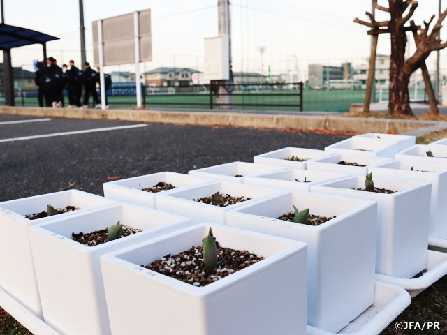 全員で協力してチューリップを育てる中で、芽が出るかどうかの不安もありましたが、なんとか全員の芽が出てきてくれて安心しました。チューリップの成長にもそれぞれ差があることを彼らも実感したのではないでしょうか。これから花を咲かせるために育て続け、卒校時には自分が育てたチューリップとともにJFAアカデミー熊本宇城を卒校していきます。そのチューリップを見ながら彼らは何を感じてくれるでしょうか。チューリップ同様に10期生がこれから成長をし、どのような特徴のある花を咲かせることができるか、期待しながら残りのアカデミー生活を充実させたものにしていきたいです。