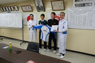 代表挨拶をする深松裕太朗とユニフォームを渡す蓑田一真