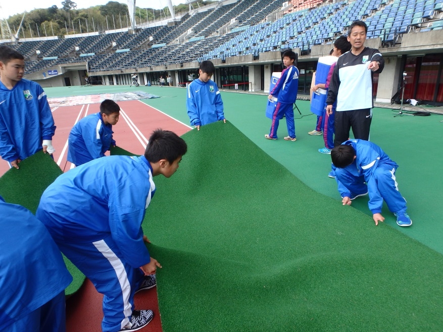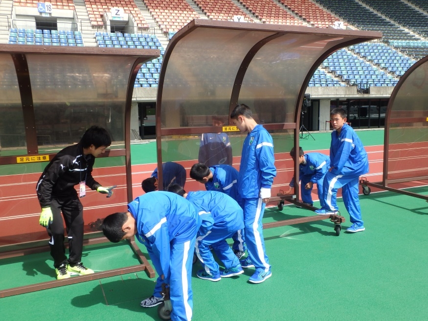 ホーム側・アウェイ側、選手たちが座るベンチのセッティングを行い、