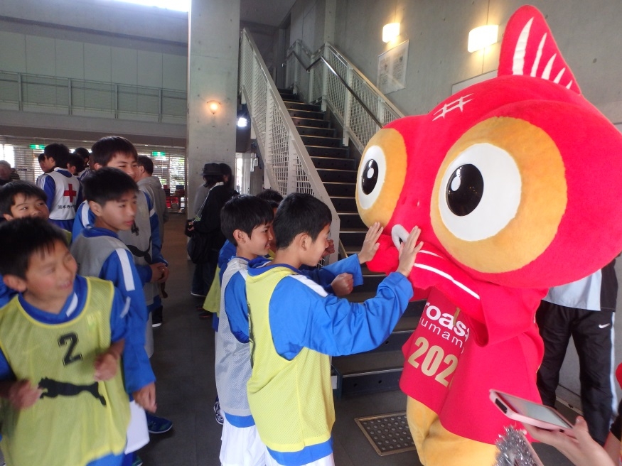 一気にテンションの上がった選手たちは、長洲町のマスコットキャラクターのふれきんちゃんとハイタッチをし、