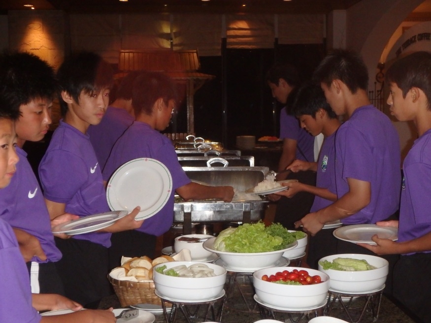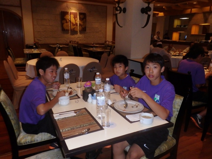 練習が終わったらホテルに戻り、レストランのビュッフェ形式の夕食を食べました。タイ料理は肉料理が多く、香辛料がたくさん使われ独特な香りがしていました。