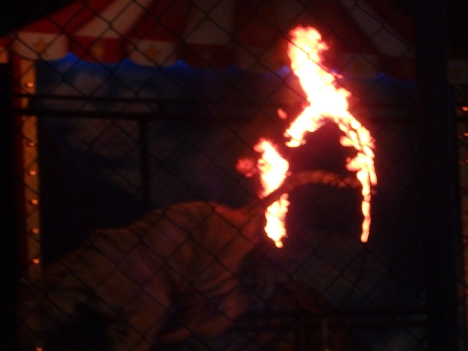 8頭の大きくて強そうなトラをたった一人のトラ使いが、まるで猫を操るように高くつるされた火の輪っかをジャンプでくぐらせたり、2本の細いロープで綱渡りをさせたり、2足歩行をさせていました。