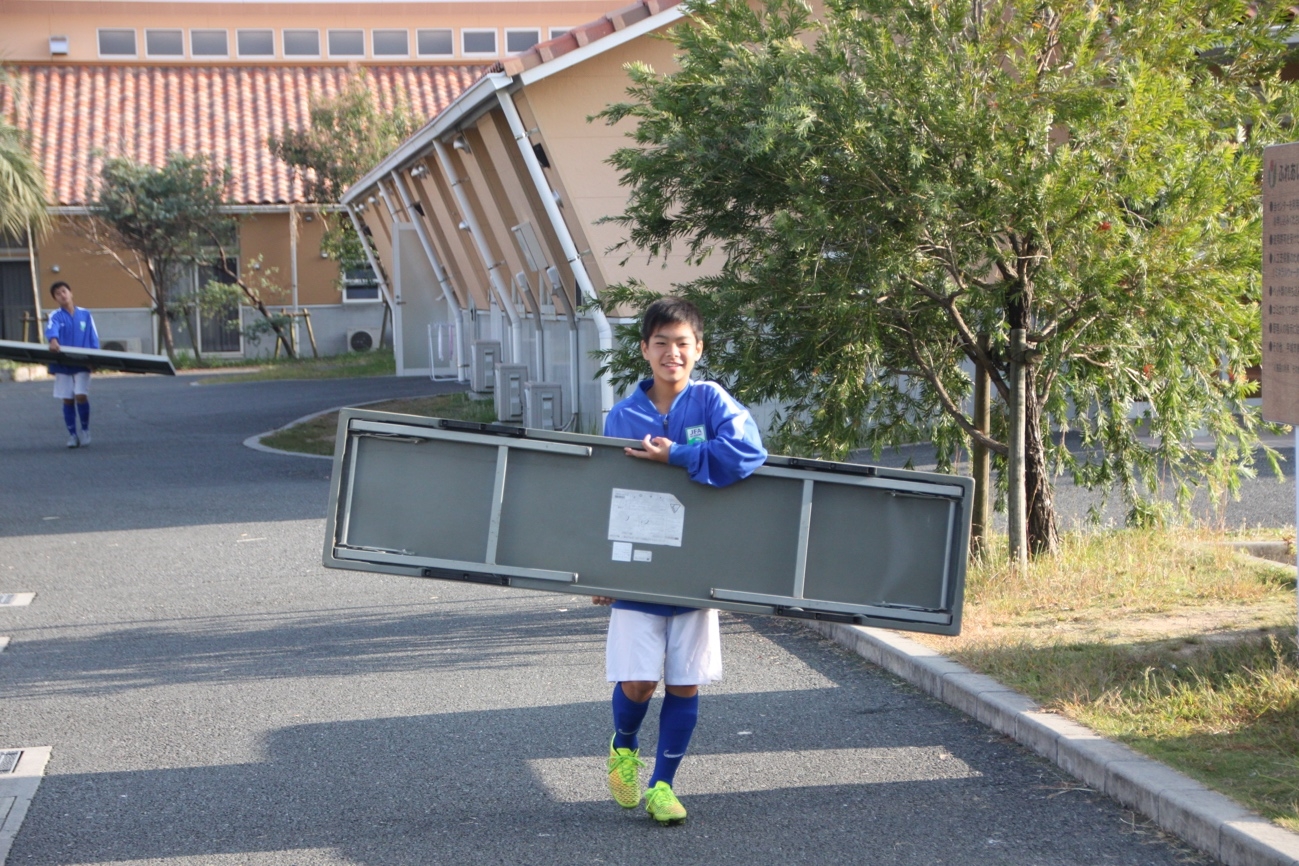 会場設営で机を運ぶ硴田大心(UKI-C.FC)