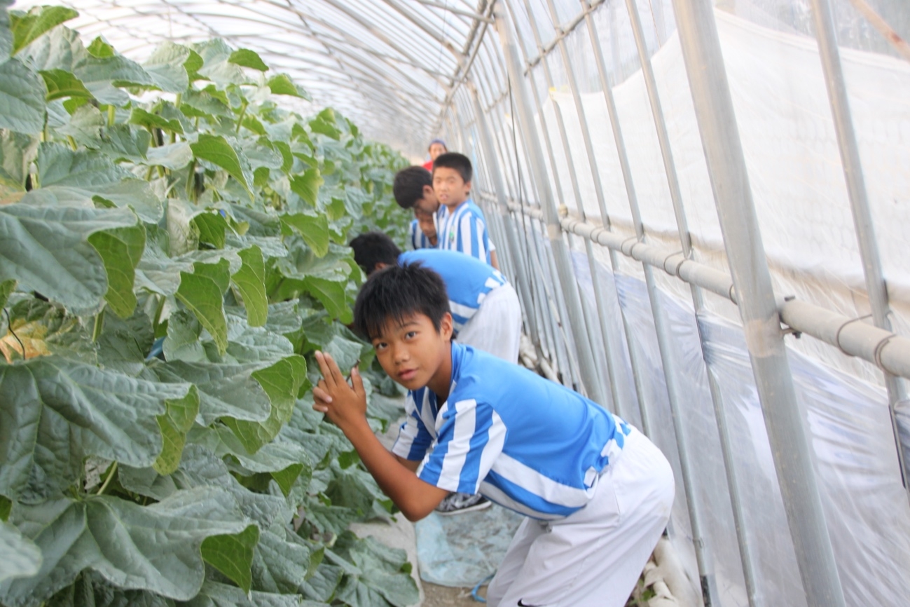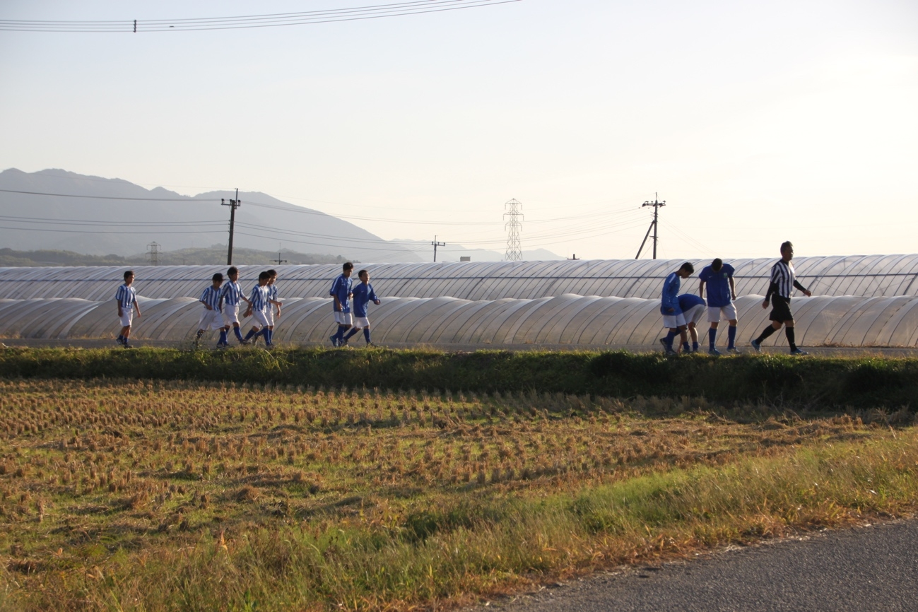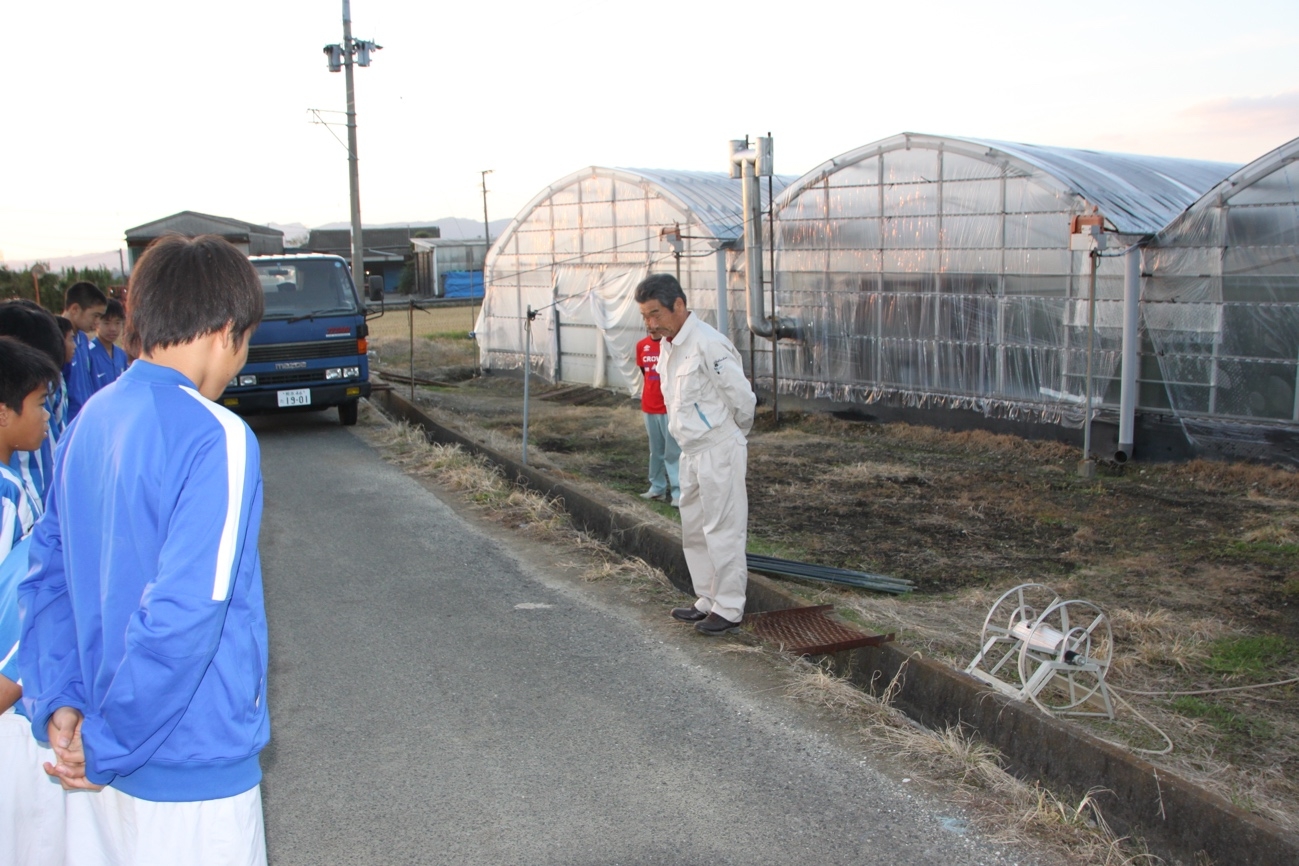 あぜ道を歩いて小川町サッカー協会会長の徳永さんのハウスに向かう一行。