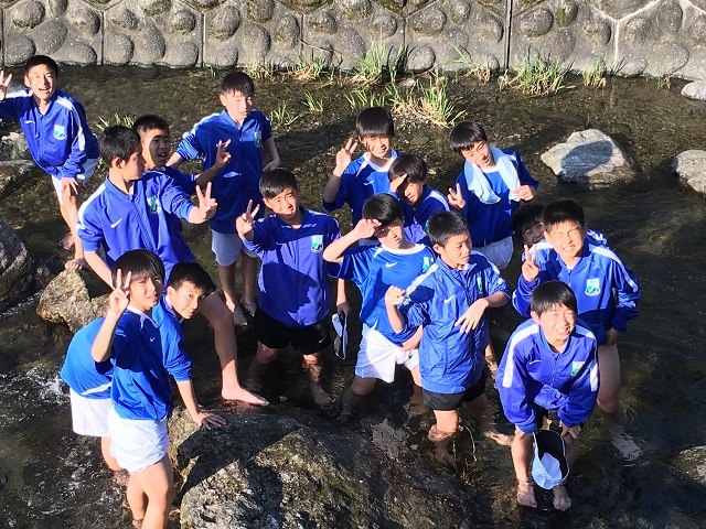 石段の登り口にある川での1枚。さすがに疲れ切った表情の9期生たち。