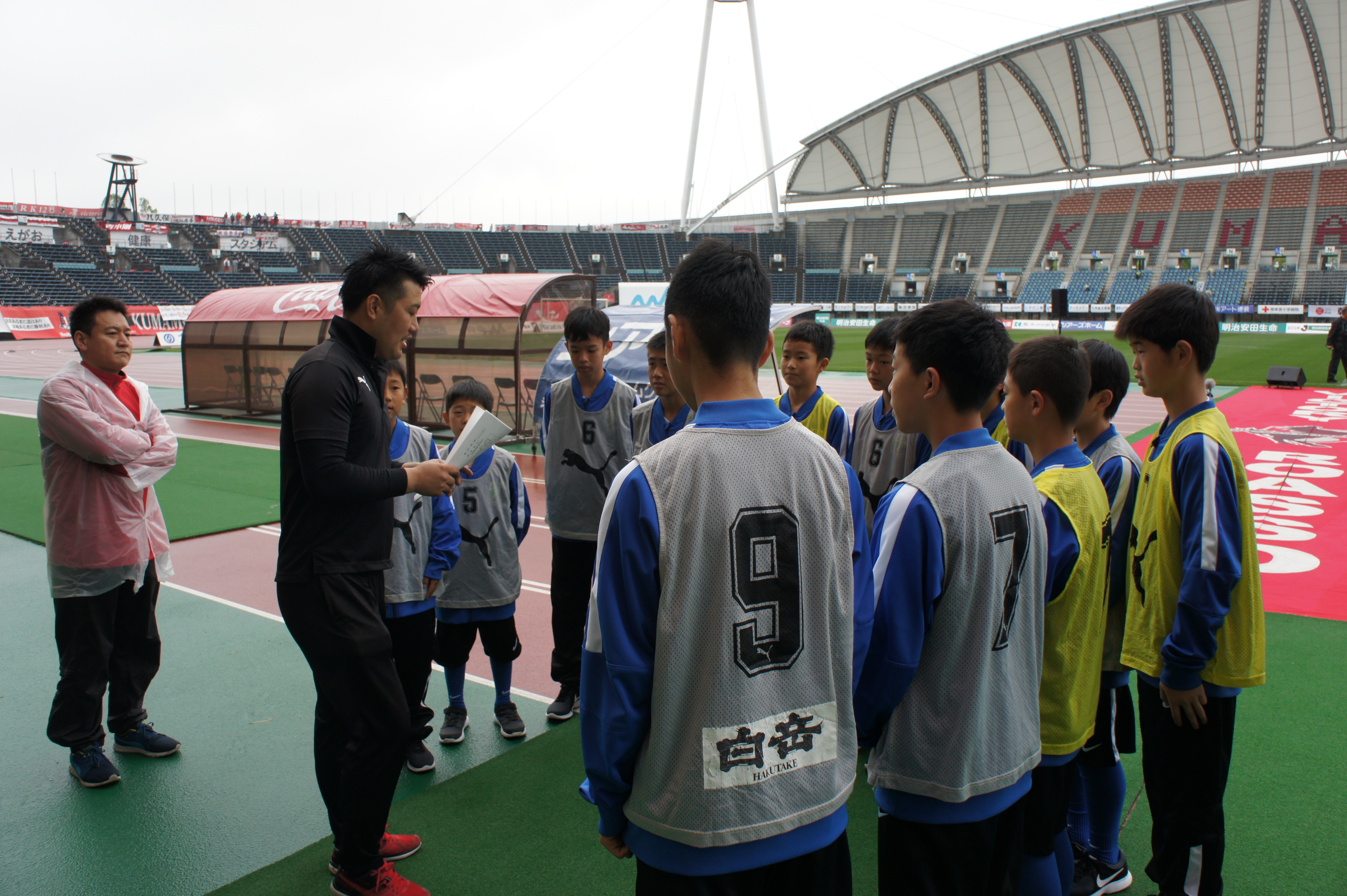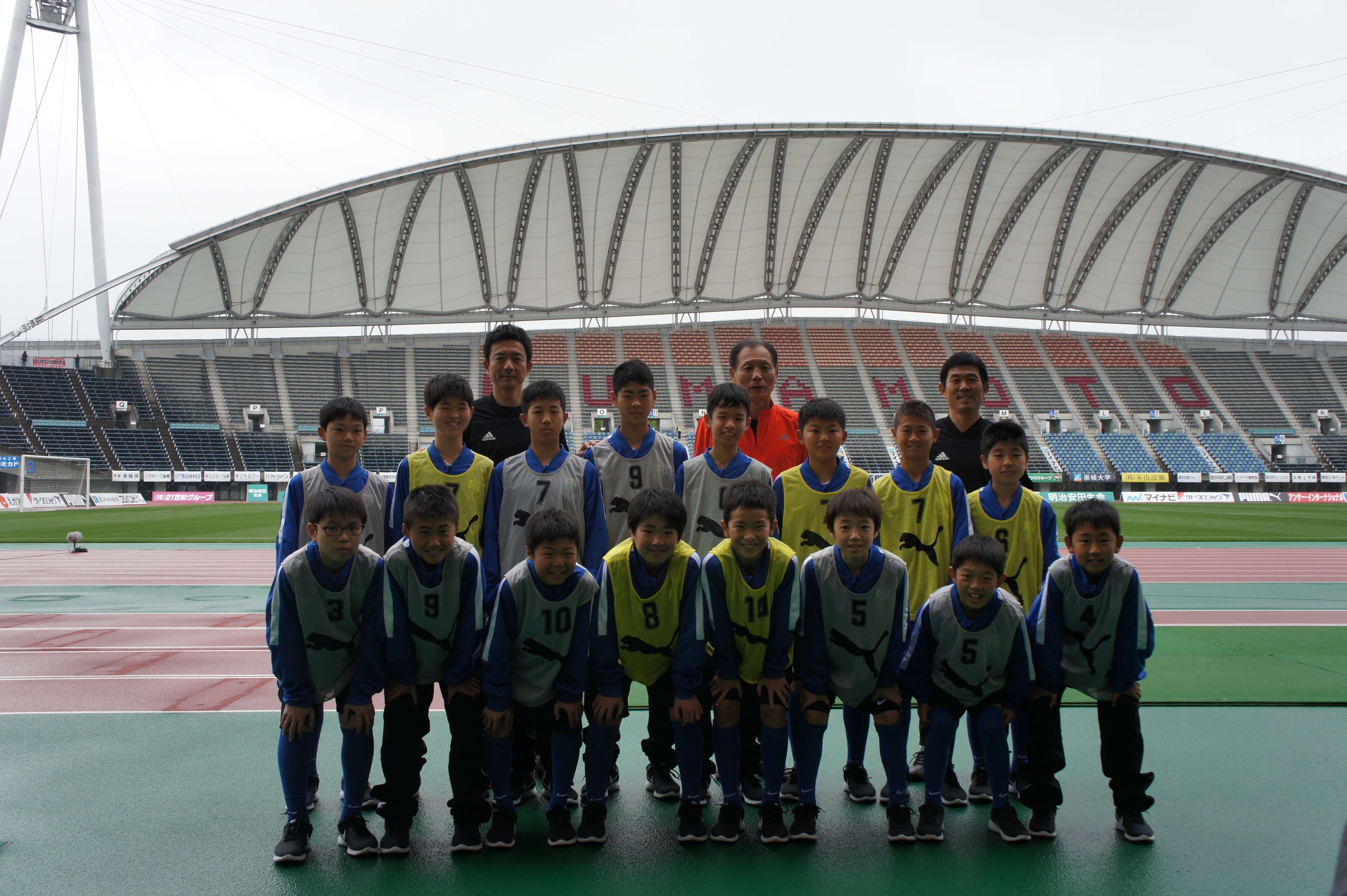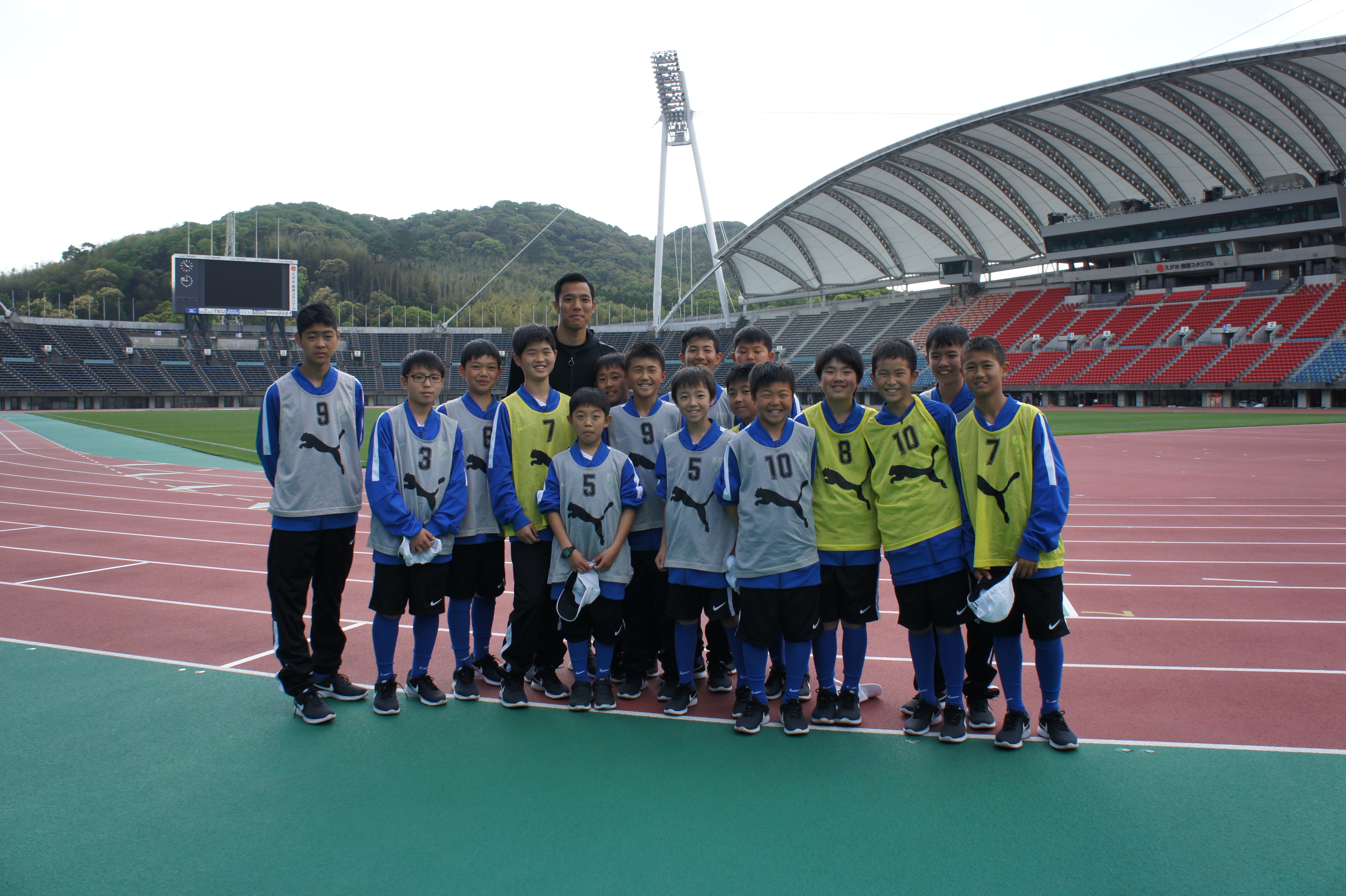 スタジアムに着くと、熊本地震復興支援の一環として開催されたサッカー教室に、スペシャルコーチとして参加していた、JFA常務理事の原博美さん、2020年東京五輪サッカー日本代表監督兼日本代表コーチの森保一さん、同代表GKコーチの下田崇さんと記念撮影。代表スタッフを目の前にし、一気にテンションが上がる10期生。