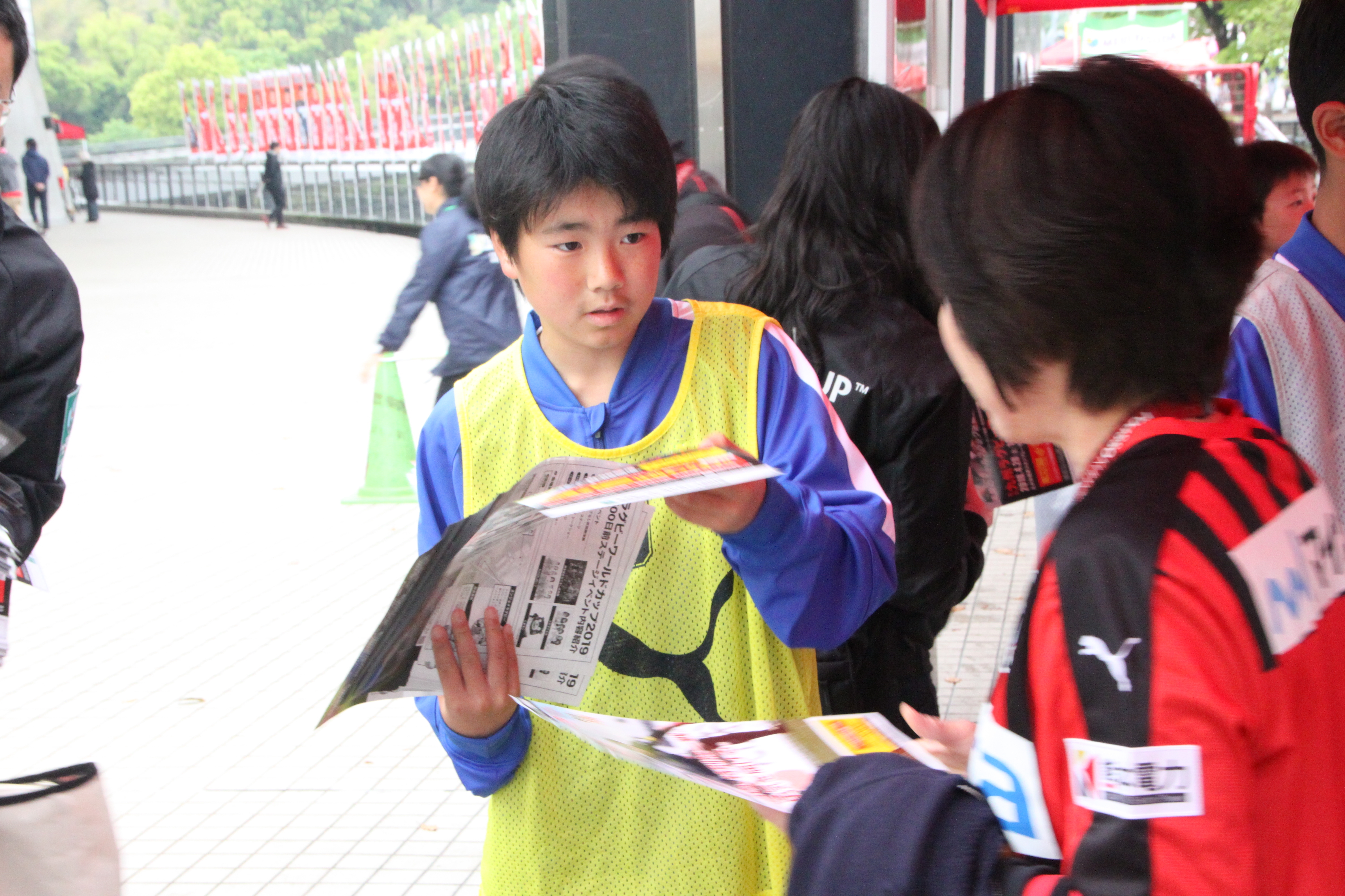 「よろしくお願いします!」大きな声で配る鈴木佑理(ロンドサッカークラブU-15)。