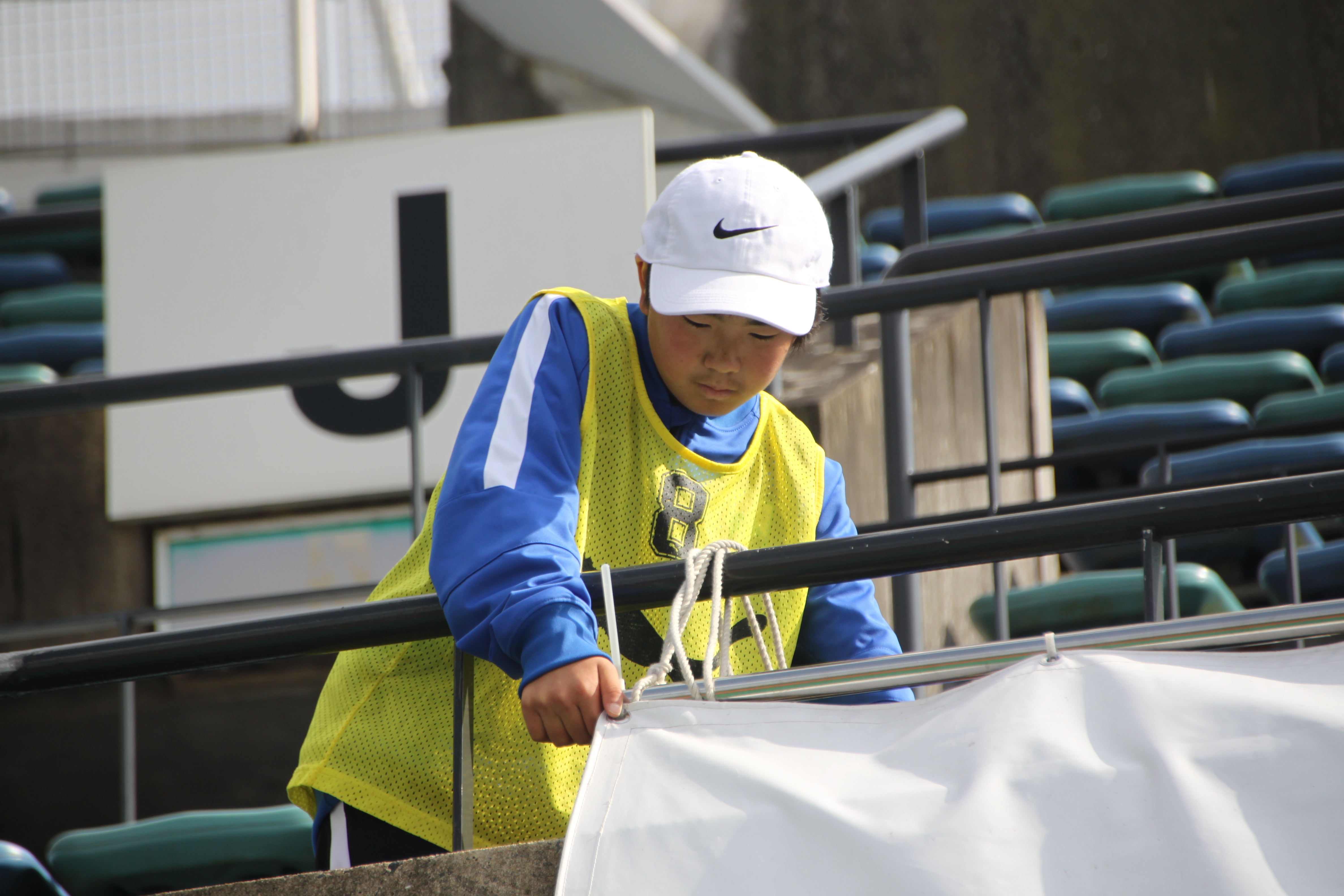 ホッとする暇もなく、試合終了後は片づけ作業を手伝います。広告のバナーをはずす宮原光輝(UKI-C.FC)