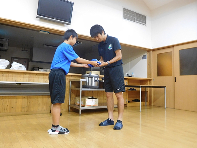 事前にアカデミー生全員で寄せ書きをしたウェアを、各学年の代表者が感謝の気持ちを添えて渡しました。