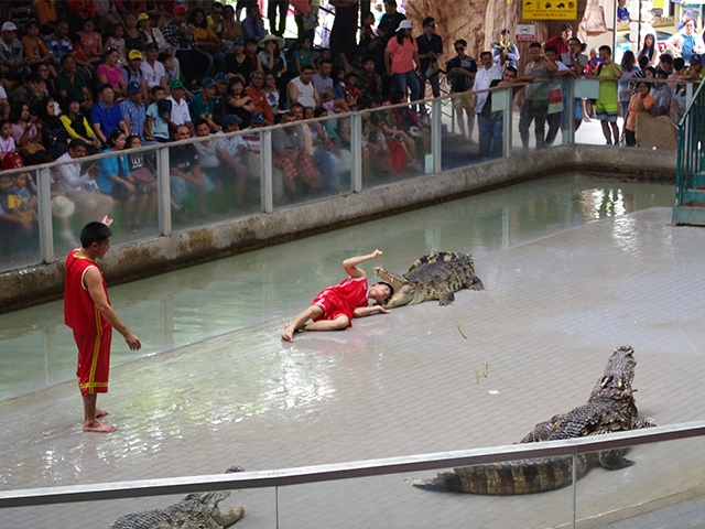 1つ目はワニのショーです。ワニ使いがワニを操り、口の中に手や頭を入れたり、ワニの上に寝転んだりしていました。噛まれてしまわないか、とてもドキドキしました。
