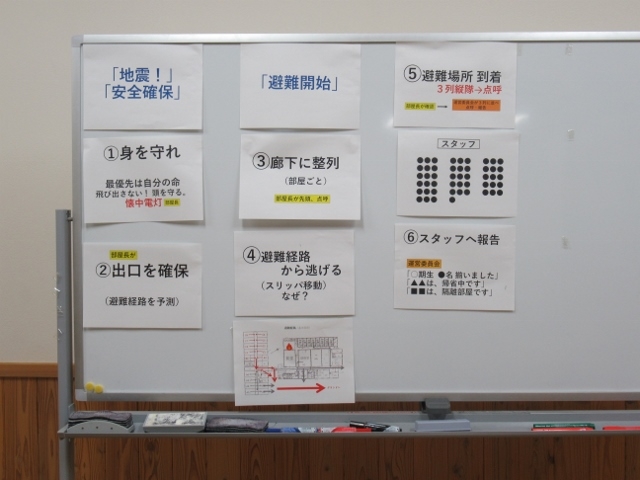 まず研修室に全員が集合し、防災担当の墨屋コーチから避難訓練の目的、地震が発生したときの注意事項の話がありました。基本情報として、この施設の避難経路の種類、出口はいくつあるのかを確認し、どの経路を選ぶのか優先順位についても考えていきました。そして今回は、就寝中に地震が発生した際の行動の手順、さらに停電を想定した場合を確認しました。寝室から避難場所へ移動する際に、どのような危険があるのか意見を出し合いました。訓練であっても一つ一つの判断、行動が冷静に出来ることを基準にしました。