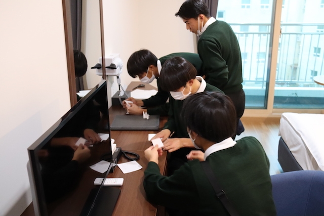 選手たちは、宿舎の掃除、片付けを済ませ、お世話になった宿舎の方々に折り鶴を作成しました。