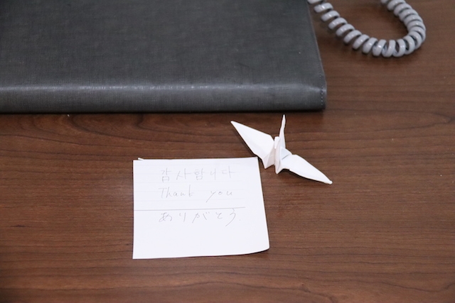 宿舎を出発する前に、お礼の気持を込めてみんなで折り鶴を作り、お礼の手紙も置かせていただきました。
