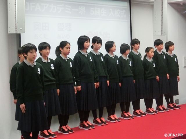 JFAアカデミー堺5期生の入校式が多くのご来賓の方々に見守られるなかで無事に行われました。初々しさのなかにも緊張した面持ちで式に臨んだ5期生ですが、各々がとても力強く決意表明することができました。式に先だって5期生だけでなく3期生、4期生に向けても田嶋会長からアカデミー創設への思いやエリート教育に関する言葉が送られ、アカデミーでの生活、この先の活動、目標や夢に対する決意をよりいっそう強固なものにしたことでしょう。今このときの希望に満ち溢れた気持ちを、いつまでも持ち続けて欲しいと思います。