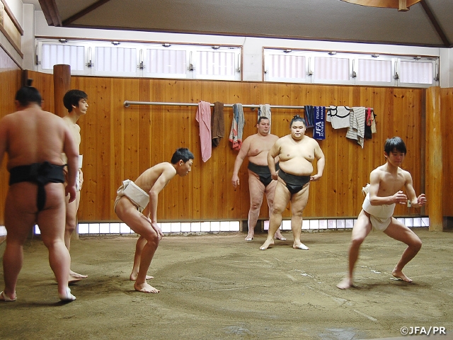実習最終日の11日(日)には、西野朗技術委員長が千賀ノ浦部屋を訪れ、アカデミー生の朝稽古の様子を見学しました。同部屋に体験入門した3人のアカデミー生たちは、伝統の重みや熱気あふれる雰囲気の中で、力士の方々と一緒に四股、股割り、すり足、ぶつかり稽古などを行いました。ぶつかり稽古では、186cm、160kgと堂々とした体格の舛東欧関に思い切ってぶつかっていきました。「最後まで押して」「だんだん押せるようになってきた」「サッカーだけじゃなくて、相撲でも大丈夫だ」と常盤山親方からも声がかかりました。