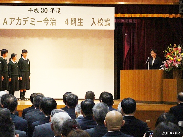 女子委員会 手塚貴子副委員長はあいさつの中でこれからの成長に期待を込め、「アカデミーでの生活を通して、気配りのできる選手になって夢を叶えてほしい」とエールを送り、新入生の決意表明では「この3年間でチームメイトと切磋琢磨し、今治から世界へ羽ばたいていけるような選手になります」と宣言しました。