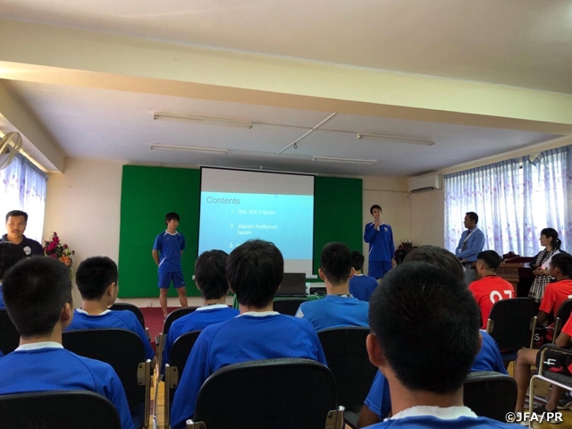 本プログラムでは、サッカー交流だけではなく在カンボジア日本国大使館やカンボジアスポーツ省、カンボジアサッカー連盟への表敬訪問や現地の学校や家庭に訪問するなどの文化交流も行われました。カンボジアの人びとへのJFAアカデミーの紹介では、自分たちで作成した資料を用いて英語でプレゼンテ―ションを行うなど、多くの初めての経験に向き合いました。