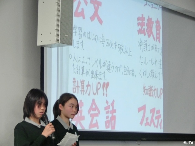 保護者、JFAアカデミー堺後援会の方々、月州中学校の先生方、J-GREEN堺やDREAM CAMPのスタッフ等、いつもお世話になっている皆様を招き、この一年間の成果や海外遠征の事前学習について、各学年のグループごとに発表しました。また1期生は、卒校を1か月後に控え、3年間の振り返りスピーチを行いました。