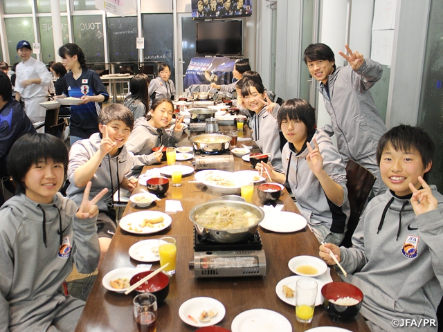 J-GREEN堺のメインピッチで、施設のスタッフの方と試合ができてとても楽しかったです。雨がたくさん降っていたので、試合に参加した人はみんなびしょ濡れになりましたが、J-GREEN堺のスタッフのみなさんが、大きな声で盛り上げてくれたので、笑顔で溢れていました。スタッフのみなさんが、いろいろなところで仕事されている姿しかみたことがありませんでしたが、一緒にサッカーをすると、みなさんとても上手で、サッカーが好きなことが伝わってきて、すごいなあと思いました。夕食のパーティの時には、4期生全員へのプレゼントとして、自分の名前が入った日本女子代表のレプリカユニフォームを頂きました。そのときに、「いつか自分の力で代表に選ばれて、本物のユニフォームを着てください」と言ってもらったので、その通り実現できるよう、これから頑張っていこうと思いました。