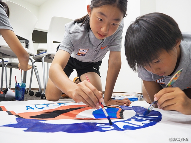 堺まつりの大パレードに向けて、みんなで旗作りをしました。1枚はJFAアカデミー堺のエンブレムを描き、エンブレムの周りに一人一人目標や夢を書きました。もう1枚は、自分たちでデザインを考えました。みんなの意見を合わせて、先輩にもアドバイスをもらいながら取り組みました。旗の布は絵の具が広がりにくい素材でとても大変でしたが、何度も塗り重ねて工夫することで綺麗に仕上がりました。1ヶ月かけて作った旗を持ちながら、パレードに出演しました。パレードコースを歩いていると、周りで見ている人が、「女子サッカーの選手やって。すごいなぁ」と、拍手をしながら声をかけてくれました。応援してくれている人がいるんだと思って、これからも頑張ろうと思えましたし、とても楽しかったです。